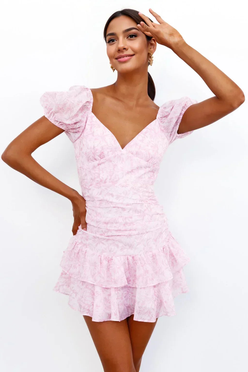 Embrace your Cute Gaze in this springtime NECESSITY! Featuring a sweetheart neckline, with short puffy sleeves, a tie-up back and a flared out ruffled hemline. Style yours with mules and waves.