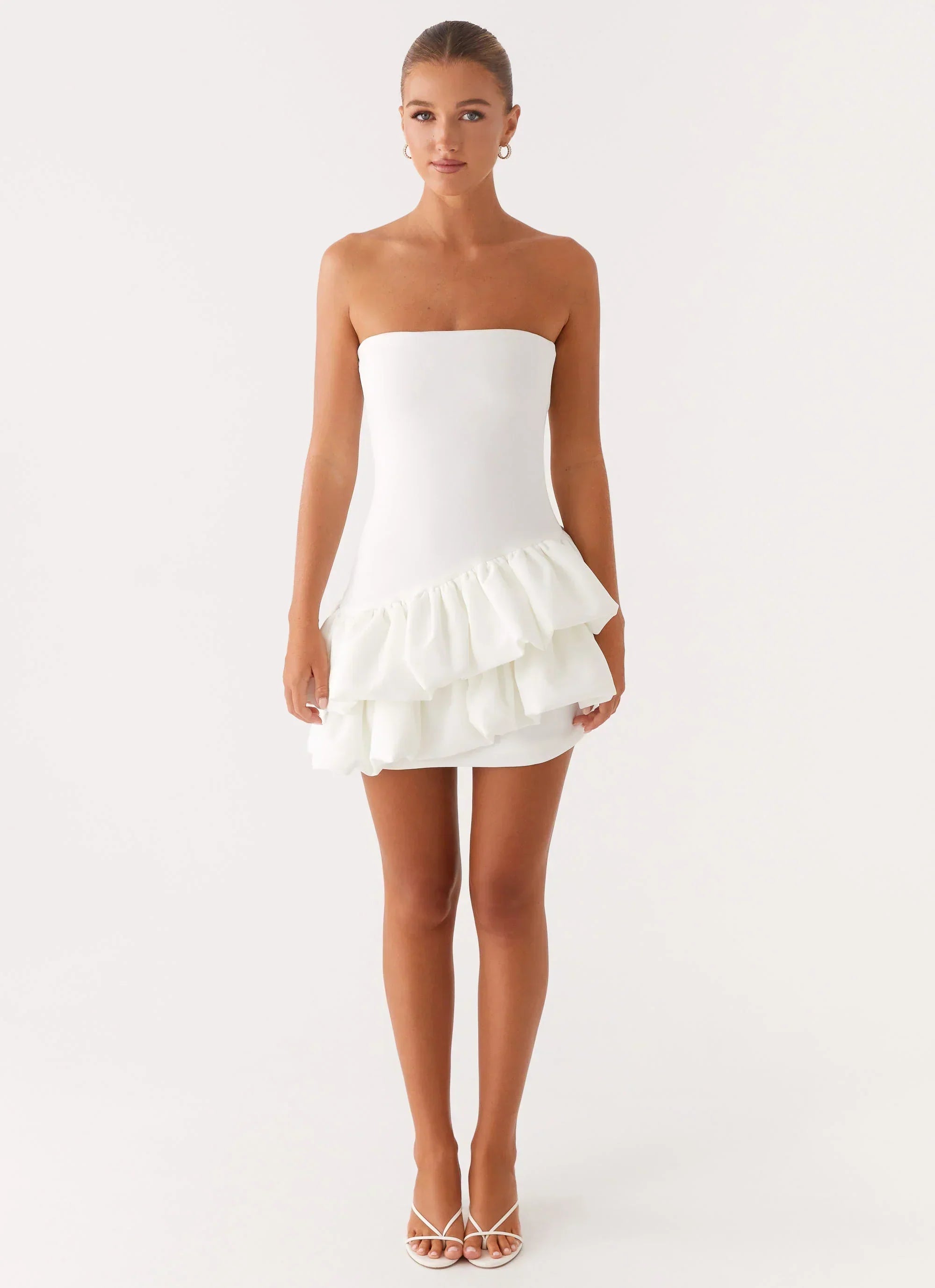 The Marie Mini Dress features a strapless neckline and a tiered ruffle hem, creating a playful yet elegant look. Perfect for summer days or casual evening outings, this dress offers a flattering fit with a fun, feminine flair.